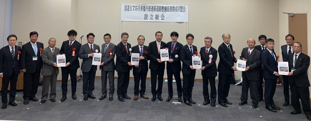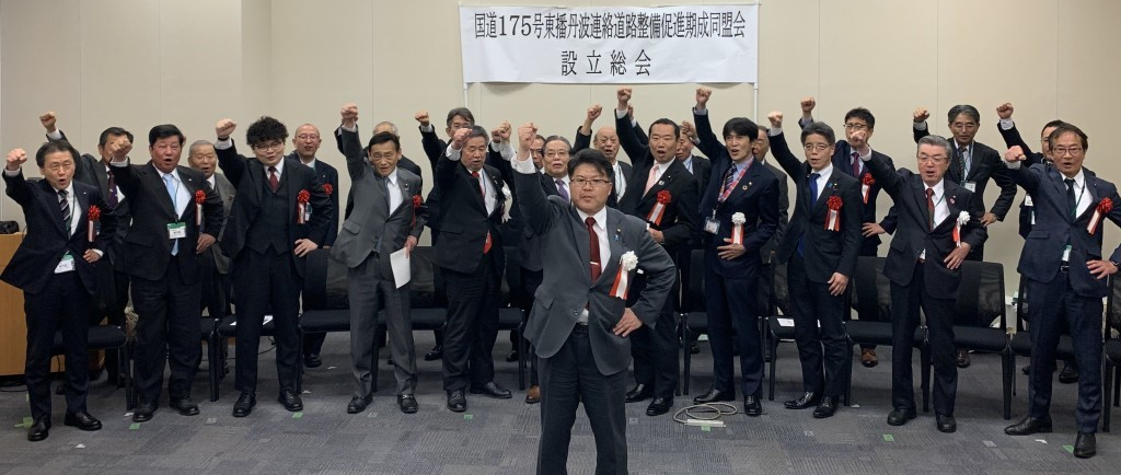 設立総会には、谷公一衆議院議員、藤井比早之衆議院議員、末松信介参議院議員、見坂茂範参議院議員、加田裕之参議院議員代理秘書、石川県議会議員、内藤県議会議員、国土交通省道路局松本健企画課長をはじめとする方々が出席し、会長に片山西脇市長、副会長に林丹波市長が就任しました。